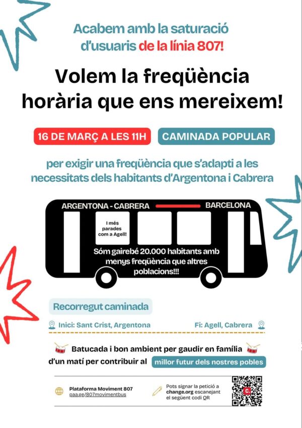 El 16 de març, la Plataforma Moviment 807 ha organitzat una caminada popular que ha sortit des de la rotonda del Sant Crist d’Argentona fins al veïnat d’Agell, al terme de Cabrera de Mar. L’objectiu és reivindicar un augment en la freqüència d’autobusos que connectin Argentona i Cabrera amb Barcelona, ja que els usuaris consideren que l’ampliació anunciada per la Generalitat no cobreix adequadament les necessitats dels dos municipis.