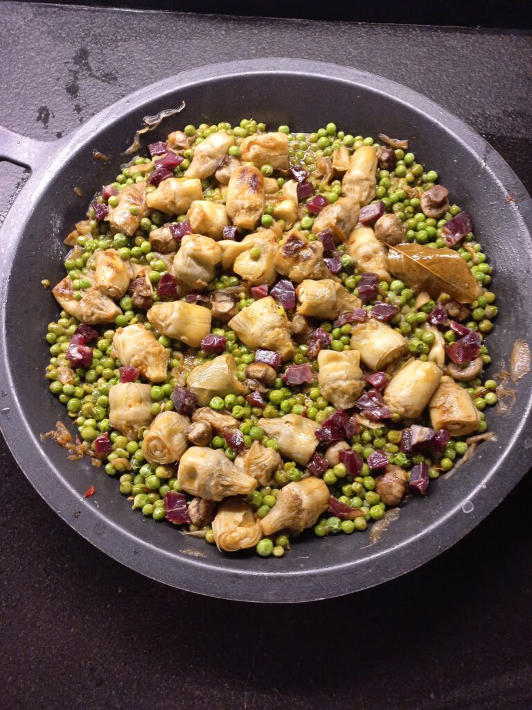 Tot seguit hi afegiu les carxofes, els xampinyons tallats a làmines i els pèsols, ho deixeu que vagi coent tot junt, amb la paella tapada.