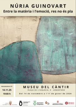 El Museu del Càntir ens proposa a partir del 14 de novembre fins l’11 de gener de 2026 l’exposició Entre la metèria i l’emoció, res no és pla de Núria Guinovart. En aquesta exposició l’artista presenta obra amb un llenguatge plàstic propi on la pintura acrílica i el ciment en són els protagonistes.